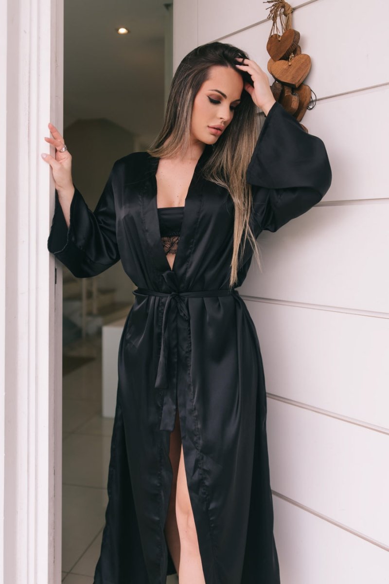 Um robe longo em cetim é uma peça de vestuário caracterizada pelo comprimento alongado e pelo tecido brilhante e suave. Ele é projetado para envolver o corpo com elegância, proporcionando uma sensação de luxo e conforto. O cetim, com seu toque sedoso e caimento fluido, realça as curvas de maneira sutil, enquanto seu brilho natural adiciona um toque de glamour. É uma peça versátil, usada tanto para momentos de relaxamento quanto para ocasiões especiais, sempre conferindo uma aparência sofisticada e refinada.