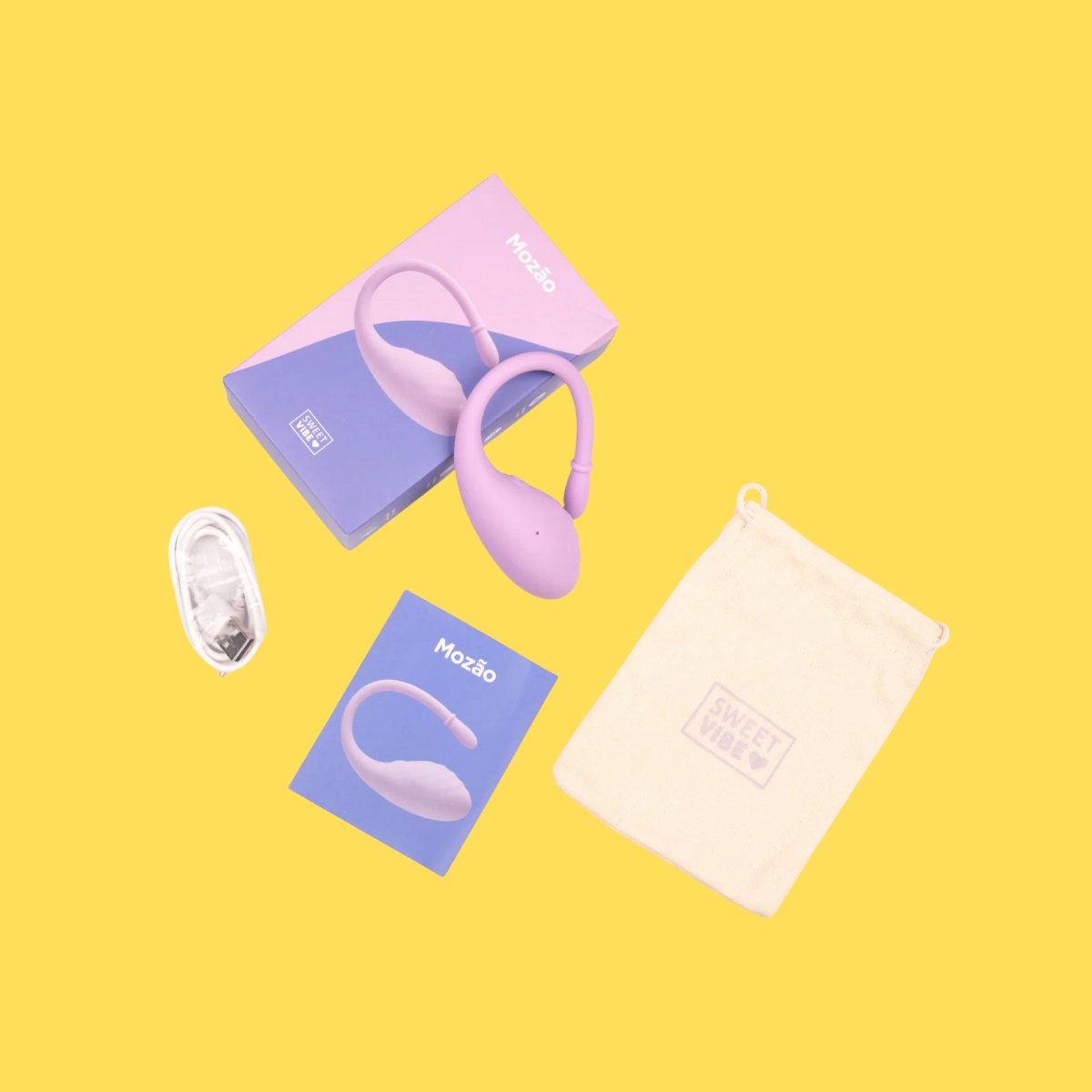 O Sweet Vibe Mozão é feito de silicone antialérgico, com um toque macio. Ele vem com um carregador USB e uma bolsa de armazenamento, pronta para acompanhar você em qualquer lugar.